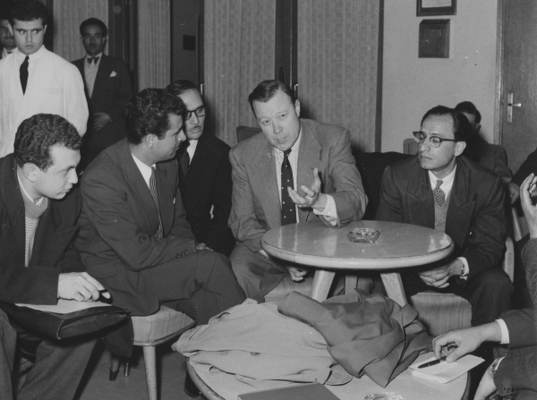 Reuther stop-over Beirut April 3, 1956, Beirut International Airport. Seated left to right: Newspaper reporter; Khalil Salim, Embassy Interpreter; Nouri Boudali, ICFTU Middle East Represenative; Walter Reuther, Ahmad Shuman, Secretary General; Jam'iat Federation. April 3, 1956