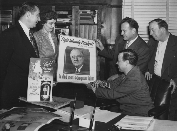 1949 "Wayne County Chapter of the National Foundation for Infantile Paralysis. Walter Reuther looking at March of Dimes poster, (hand in brace, seated at desk) "left to right: Emil Mazey, unidentified woman, WPR, Jack Livingston, Richard Gosser.