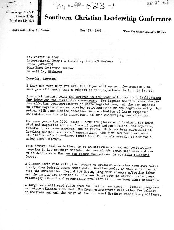 Letter from Martin Luther King Jr. for Walter Reuther (page 1) circa May 23, 1962