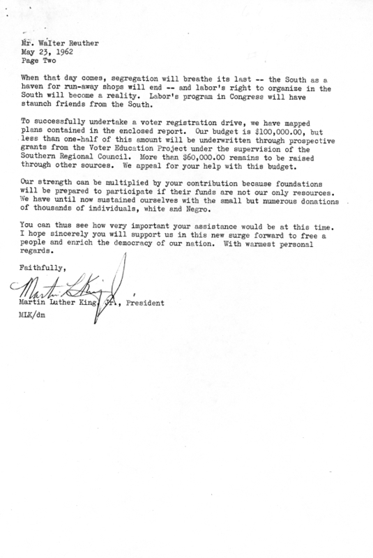 Letter from Martin Luther King Jr. for Walter Reuther circa 1962 (page 2)