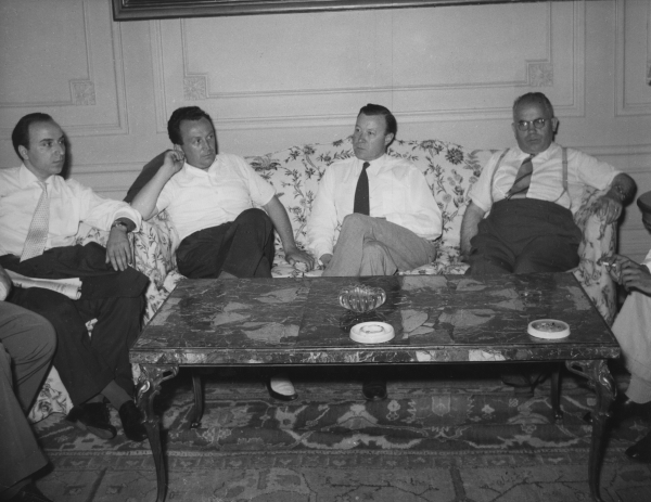 Joint meeting of UIL_CISL secretariats at Grand Hotel Rome, July 24, 1953."Left to Right: Paolo Cavezzali, CISL Secretariat; Italo Viglionesi, UIL Secretariat; Walter Reuther; Giulio Pastore, Sec. Gen. CISL."