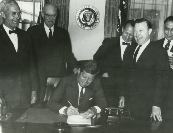 Left to Right:-1. Murray Lincoln, Nationwide Insurance Co. and Cooperative Movement.-2. ???-3. President John F. Kennedy-4. Norman Cousins, The Saturday Review.-5. Walter P. Reuther, President of UAW."ca. 1962"