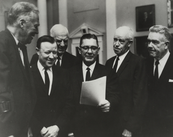 Reuther outside committee room, in group House Ways and Means on international trade (HR9000). Left to Rght: Christian Herter, Reuther unidentified, Rep. Wilbur Mills, Omar Bradley, McNamara."March 21, 1962"