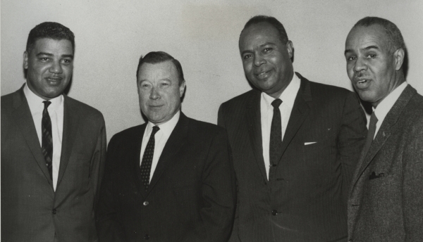Reuther meets with African-American leaders. Left to Right: Whitney Young, Director of the National Urban League, Walter Reuther, James Farmer, National director of CORE, Roy Wilkins, NAACP."February 13, 1963"
