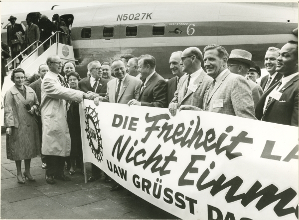 West Berlin - UAW group arrives carrying sign "Freedom will not be Walled In UAW Greets Free Berlin""July 1962"